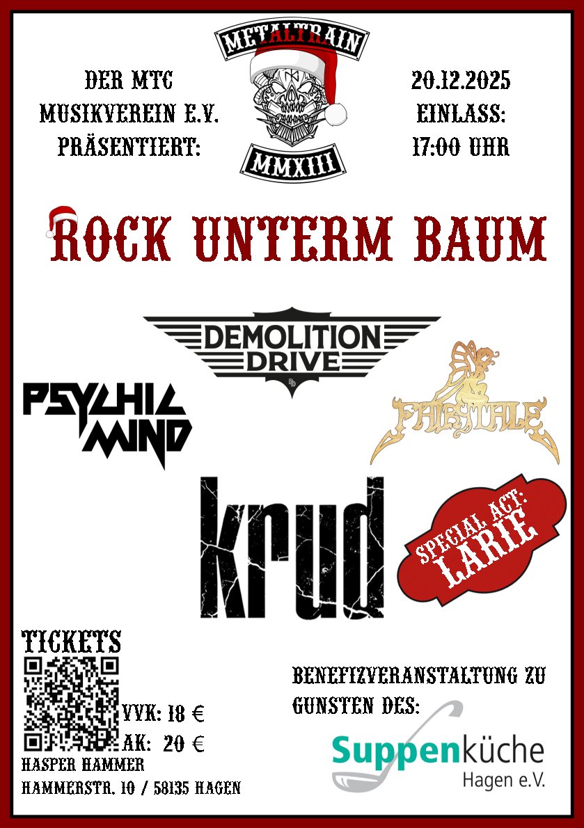 Am 20. Dezember läuft wieder das Konzert >> Rock unterm Baum << im Hasper Hammer. Einlass ist 17:00.